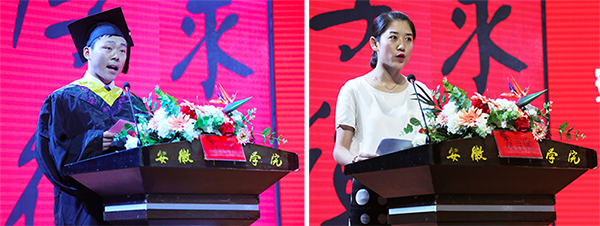 儀式上,畢業生代表劉錄洋回顧了四年大學生活的點滴回憶,表達了對母校培育之恩的無限感激和對這片知識沃土的眷戀之情,表示將通過一點一滴的積累奮斗,努力開創更加美好的未來。教師代表董甜甜向畢業生們表示祝賀,她肯定了同學們四年的成長,向全體畢業生提出了殷切期望,并送上了飽含深情的叮囑和希冀。