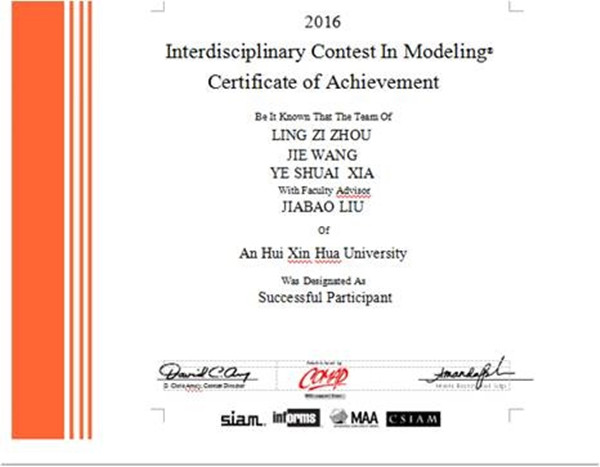美國(國際)大學(xué)生數(shù)學(xué)建模競(jìng)賽與交叉學(xué)科數(shù)學(xué)建模競(jìng)賽(MCM/ICM)官方網(wǎng)站揭曉了2016年美國大學(xué)生數(shù)學(xué)建模競(jìng)賽結(jié)果。安徽新華學(xué)院本科生組成的2支參賽隊(duì)伍首次參加此項(xiàng)國際賽事,經(jīng)過四天四夜(1月29日-2月2日)96個(gè)小時(shí)的緊張奮戰(zhàn),由大學(xué)生數(shù)學(xué)建模協(xié)會(huì)成員組建的兩支隊(duì)伍:王杰、謝杰、陽升鵬和夏業(yè)帥、周玲子、王杰(重名)等同學(xué)最終從12446支全球參賽中脫穎而出,獲得兩個(gè)國際三等獎(jiǎng)的好成績(jī)。